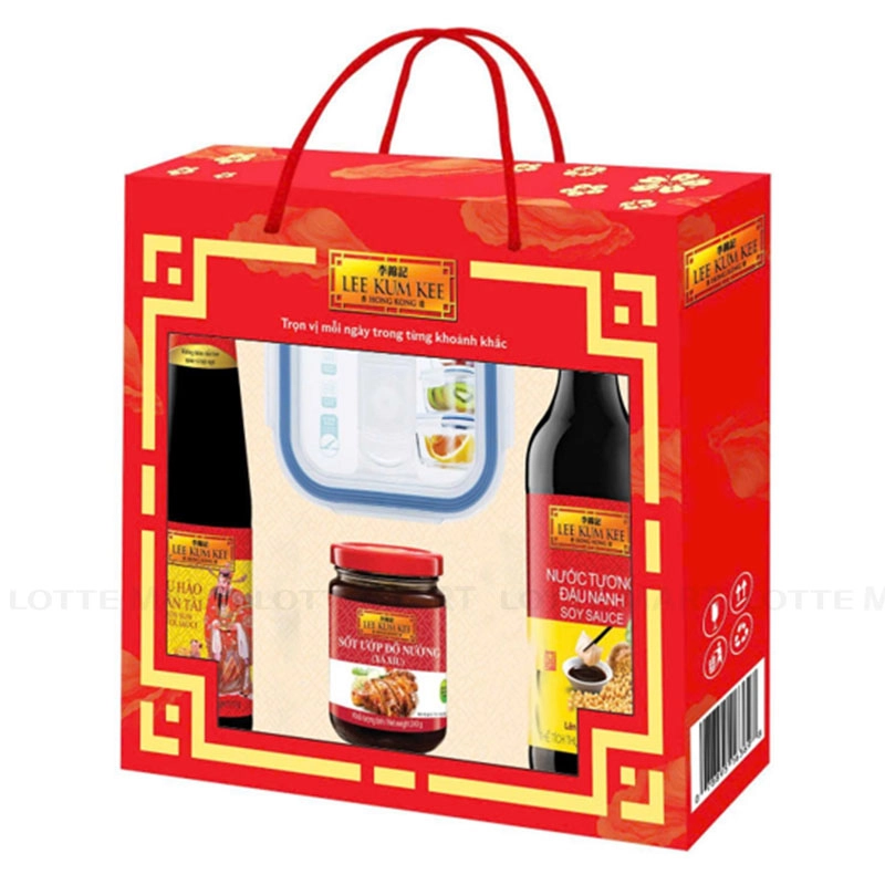 - Sản phẩm trong hộp quà tết gồm 4 món: Dầu Hào Thần Tài Lee Kum Kee Chai 510G, Nước Tương Đậu Nành Lee Kum Kee Chai 500ml, Sốt Ướp Thịt Lee Kum Kee Vị Xá Xíu Hũ 240G, Dụng Cụ Băm Tỏi Ớt Lock And Lock