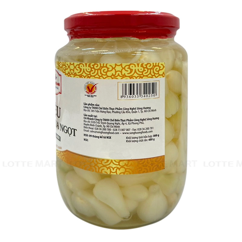 Thành phần: củ kiệu (52%), dấm, nước, muối, đường, ớt. Chất bảo quản: kali sorbate (202), natri benzoate (211). Phụ gia thực phẩm khác: chất chống oxy hóa (natri metabisulphite (223)).Kiệu ngâm chua ngọt Sông Hương được đóng dưới dạng lọ kín đáo, dễ dàng sử dụng và bảo quản.Hướng dẫn sử dụng: Dùng trực tiếp khi mở nắp, ăn kèm với cơm.