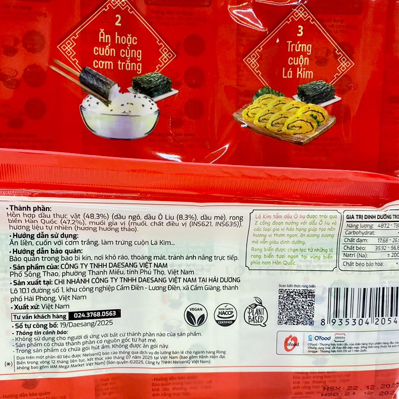 Lá Kim Tầm Dầu Ô Liu O'Food là loại snack ăn liền được làm từ rong biển Hàn Quốc sấy khô.