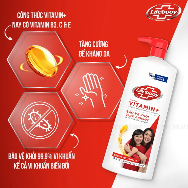 - Sữa tắm Lifebuoy bảo vệ vượt trội với công thức vượt trội chứa Ion Bạc và bọt kem siêu mịn, có khả năng thẩm thấu sâu vào lỗ chân lông, giúp làm sạch sâu và bảo vệ làn da khỏi tác hại của vi khuẩn gây bệnh tốt hơn gấp 10 lần.
