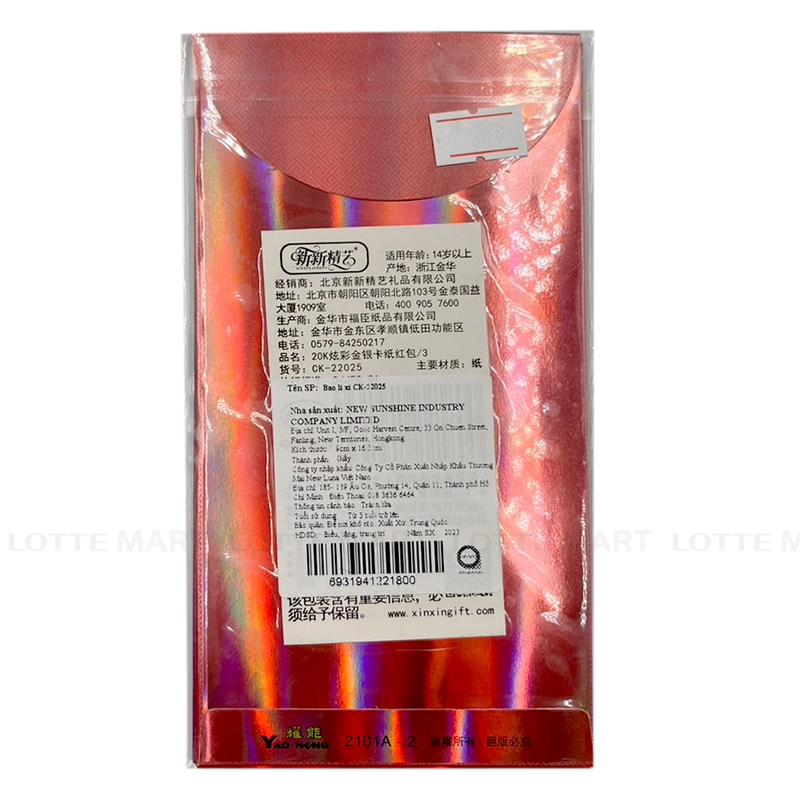 - Bao Lì Xì CK-22025 được làm từ chất liệu giấy dày dặn, bền màu theo thời gian, kết hợp cùng với kỹ thuật in ấn sắc nét, tạo nên vẻ đẹp sang trọng..