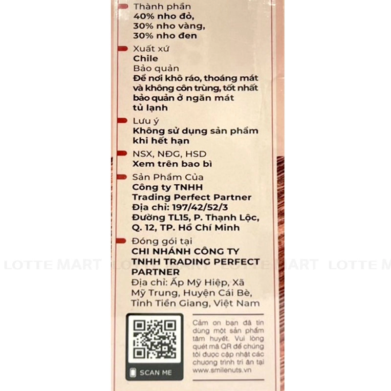- 100% nho khô Chile (40% nho đỏ, 30% nho vàng, 30% nho đen).