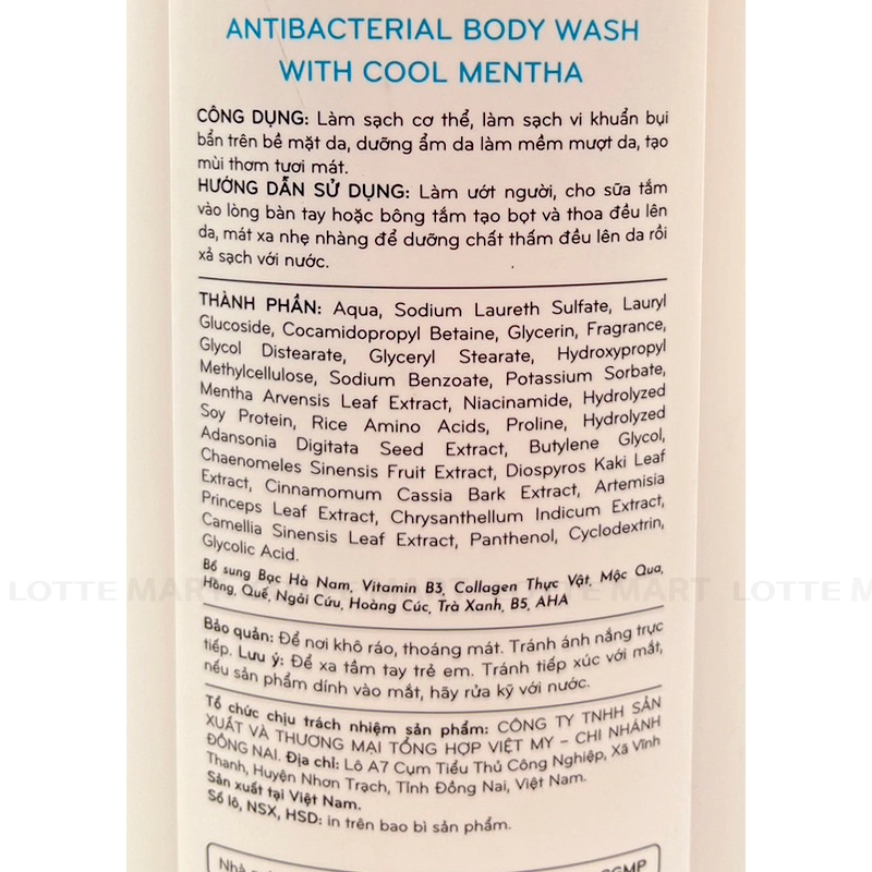 - Sữa tắm giúp làm sạch cơ thể, làm sạch bụi bẩn trên bề mặt da, dưỡng ẩm da, làm mềm mượt da, tạo mùi thơm tươi mát cùng hương bạc hà.