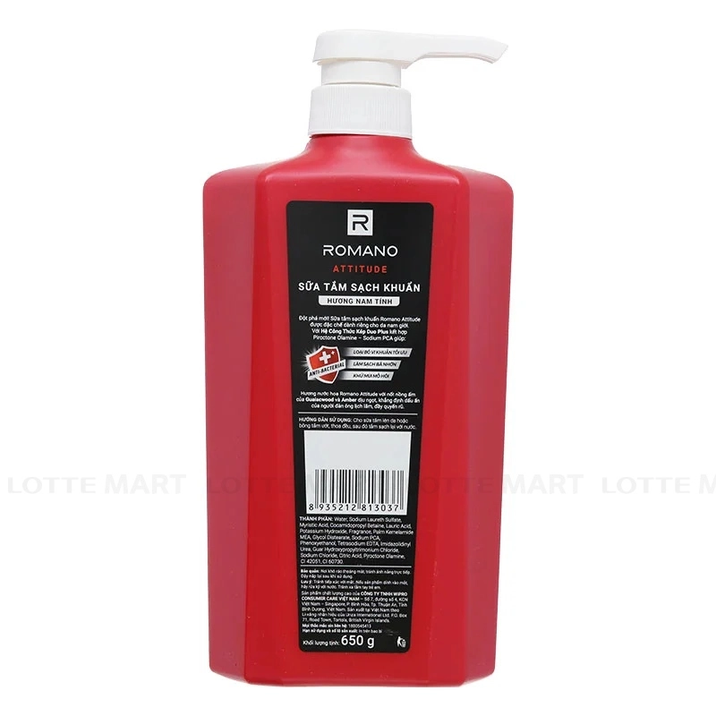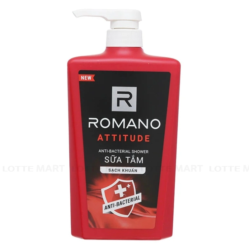 - Sữa tắm Romano Attitude là dòng sản phẩm sữa tắm nổi bật của thương hiệu Romano với hương nước hoa nồng ấm của Guaiac Wood và Amber dịu ngọt, mang lại cho bạn mùi hương nam tính, cùng lưu hương lâu giúp bạn thoải mái vận động cả ngày dài. Ngoài ra, còn bổ sung thành phần giữ ẩm Sodium PCA cho một làn da sạch, mềm mịn, đầy sức sống.