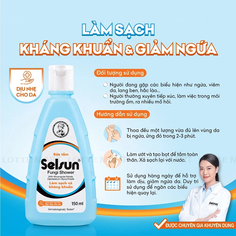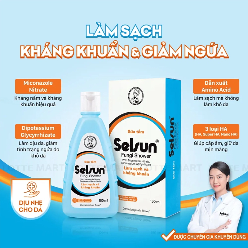 - Sữa Tắm Selsun Làm Sạch Da Và Kháng Khuẩn Chai 150ml có chứa thành phần đặc biệt là Miconazole Nitrate là thành phần có tính kháng nấm.