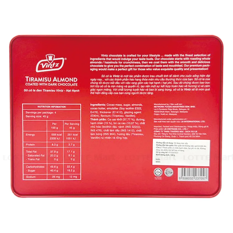 - Với chất lượng tuyệt hảo và bao bì sang trọng, Socola Vintz sẽ là món quà thể hiện đẳng cấp của bạn cùng người được tặng. Socola Vintz được đựng trong hộp thiếc sang trọng, đẹp mắt, thích hợp dùng làm quà biếu tặng người thân, bạn bè trong các dịp gặp mặt, lễ Tết.