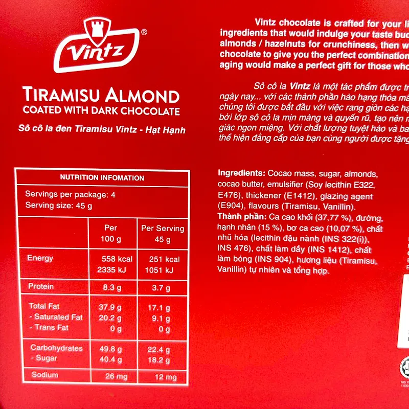 - Kẹo được sản xuất trên dây chuyền hiện đại theo công nghệ tiên tiến, đảm bảo đưa đến tay người tiêu dùng những sản phẩm chất lượng cao. Sô cô la Vintz được làm từ cacao, đường, hạnh nhân, dầu thực vật, bơ cacao… theo công thức đặc biệt, tạo nên mùi vị thơm ngon khó quên. Socola đen chống oxi hóa, tốt cho tim mạch.