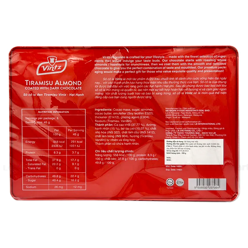 - Socola Vintz Đen Hạnh Nhân Hộp 320G khởi đầu bởi lớp socola đen mịn màng, đậm đà hương vị cacao, ngập tràn bên trong một lớp hành nhân giòn thơm ngon đặc sắc. Kiệt tác này mang đến sự hòa quyện độc đáo về hương vị và cảm giác ngon miệng với chất lượng tuyệt hảo.