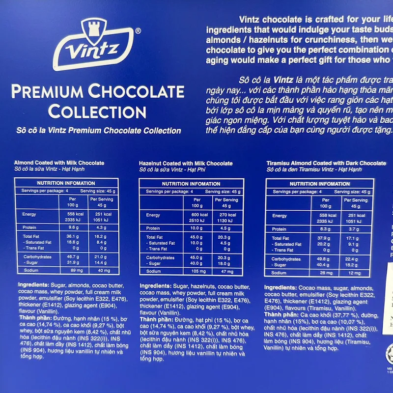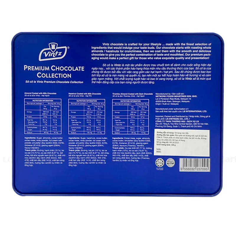 - Socola Đen Vintz Premium Hộp 160G chưa ba loại socola gồm Socola Sữa Hạnh Nhân, Socola Sữa Hạt Phỉ, Socola Đen Tiramisu Hạnh Nhân. Các loại socola này đều khởi đầu bởi lớp socola đen mịn màng, đậm đà hương vị cacao, ngập tràn bên trong một lớp nhân thơm ngon đặc sắc. Kiệt tác này mang đến sự hòa quyện độc đáo về hương vị và cảm giác ngon miệng với chất lượng tuyệt hảo.