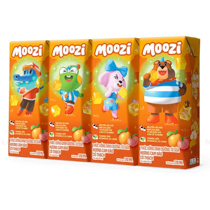 - Thức Uống Dinh Dưỡng Từ Sữa Moozi Hương Cam Đào Có Thạch là thức uống kết hợp giữa vị trái cây thanh mát và sữa thơm dịu. Mỗi hộp nhỏ gọn chứa thạch giòn dai kết hợp cùng vị cam và đào hài hòa, dễ uống.