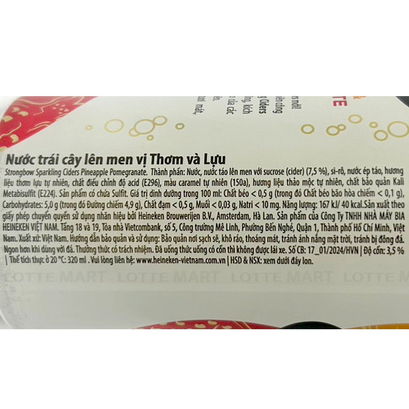 - Nước Trái Cây Lên Men Strongbow Vị Thơm Lựu 3.5% Lon 330ml là một sự kết hợp hoàn hảo giữa sự tinh tế trong quá trình lên men và hương vị độc đáo của trái cây. Sản phẩm này được chế tạo từ nước trái cây lên men tự nhiên, kết hợp khéo léo giữa vị ngọt nhẹ nhàng của dứa nhiệt đới và vị chua thanh mát của lựu. Quá trình lên men tỉ mỉ tạo nên một hương vị phong phú và cân bằng, mang lại trải nghiệm uống thú vị và khác biệt.