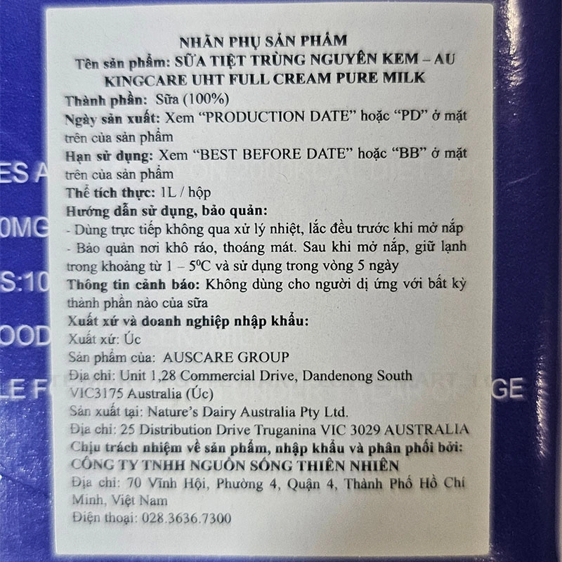 - Sữa Tươi Tiệt Trùng AU Kingcare Nguyên Kem 3.5% được nhập khẩu từ Úc, sử dụng nguồn nguyên liệu từ sữa bò tươi, không bổ sung đường, giúp giữ được độ thanh mát và vị béo nhẹ đặc trưng.