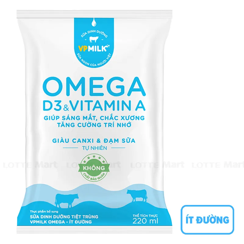 - Sữa Tươi Tiệt Trùng Ít Đường VPMilk Omega với công thức dưỡng chất hoàn thiện, kết hợp Vitamin A giúp sáng mắt, VItamin D3 hỗ trợ hấp thu canxi và bổ sung Omega giúp tăng cường trí nhớ, hỗ trợ ngăn ngừa giảm trí nhớ.