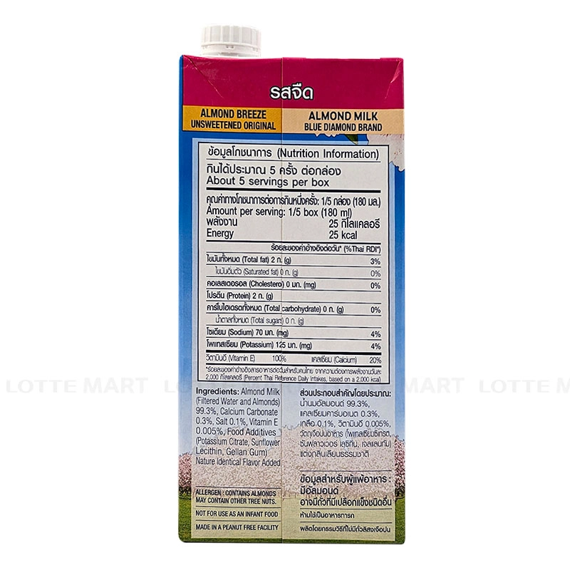 - Sữa Hạnh Nhân Almond Breeze Nguyên Chất Không Đường được làm từ hạnh nhân nguyên chất kết hợp cùng nước tinh khiết, mang đến hương vị hạnh nhân thanh nhẹ, thơm dịu. Dòng Không Đường không chứa đường bổ sung, không sữa bò, cholesterol và đậu nành - lý tưởng cho người ăn kiêng, người ăn chay hoặc những ai dị ứng với sữa bò.