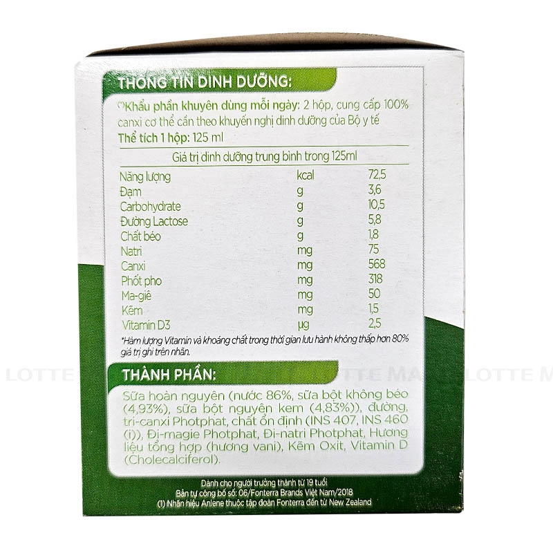 Năng lượng: Năng lượng: 72.5Kcal, đạm: 3.6g, Carbohydrate: 10.5g Trong 1 hộp sữa 125ml.
