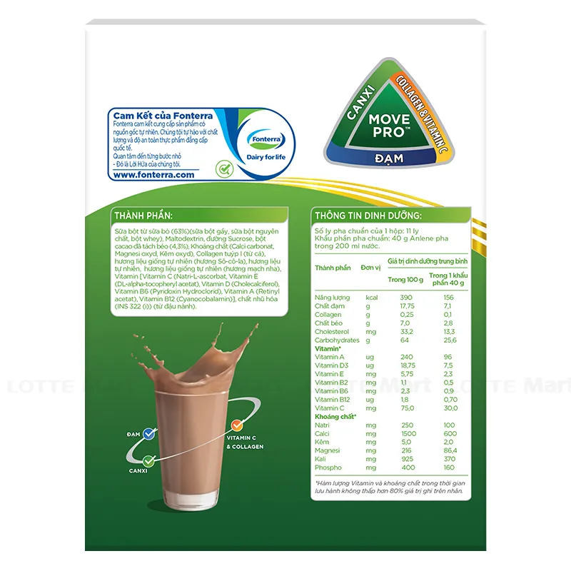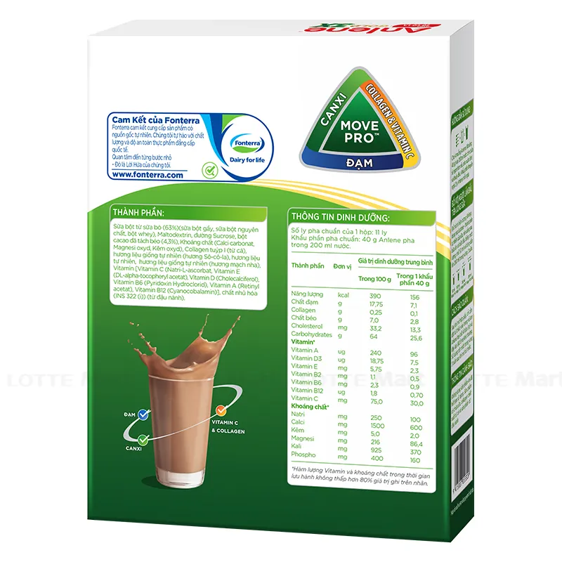 - Sữa bột từ sữa bò (63%)(sữa bột gầy, sữa bột nguyên chất bột whey), Maltodextrin, đường Sucrose, bột cacao đã tách béo (4.3%), Khoáng chất (Calci carbonat, Magnesi oxyd, Kẽm oxyd), Collagen tuýp 1 (từ cá), hương liệu giống tự nhiên (hương mạch nha), Vitamin [Vitamin C (Natri-L-ascorbat, Vitamin E (DL-alpha-tocopheryl acetat), Vitamin D (Cholecalciferol), Vitamin B6 (Pyridoxin Hydroclorid), Vitamin A (Retinyl acetat), Vitamin B12 (Cyanocobalamin)], Chất nhũ hóa (INS 322(i)) (từ đậu nành).