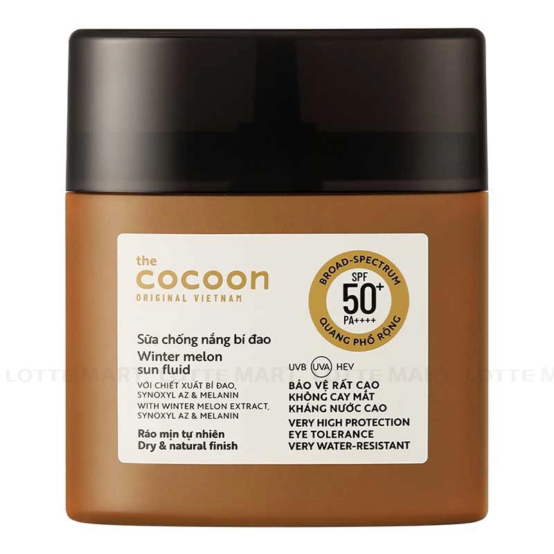 - Sữa Chống Nắng Bí Đao Cocoon Quang Phổ Rộng SPF 50+ PA++++ với 7 màng lọc tiên tiến, sữa chống nắng sẽ bảo vệ làn da của bạn khỏi tác hại của tia UVA, UVB và HEV.