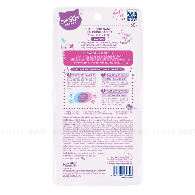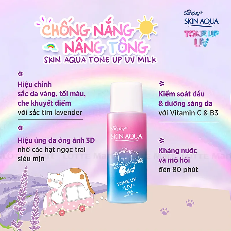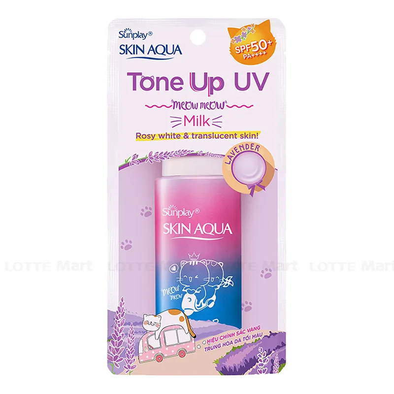 Sunplay Skin Aqua Tone Up UV Milk SPF50+ PA++++ 50G Hiệu chỉnh sắc da: Sự hòa quyện sắc xanh và sắc hồng độc đáo tạo nên sắc tím hoa Lavender giúp che phủ tự nhiên, nâng tông da sáng hồng.