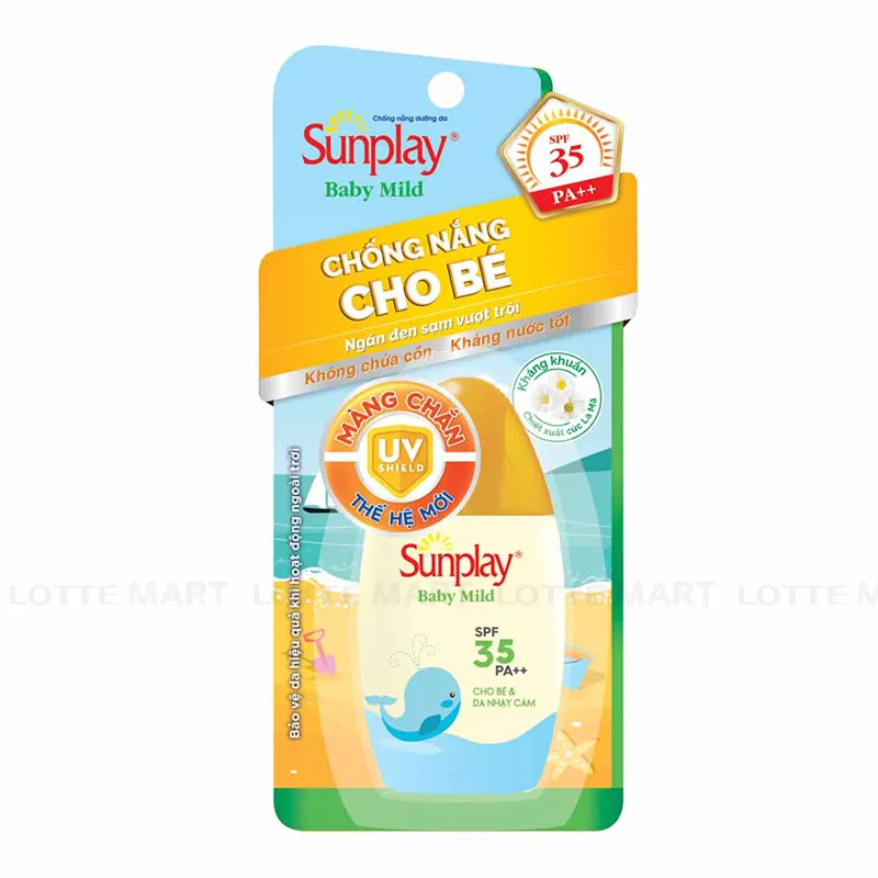 - Sữa Chống Nắng Sunplay Cho Bé Và Da Nhạy Cảm 30G SPF35/PA++ là kem chống nắng thuộc thương hiệu Sunplay. Với công thức được đặc chế riêng cho bé và da nhạy cảm, bảo vệ làn da mỏng manh dưới ánh nắng mặt trời. Đồng thời, tính kháng nước và mồ hôi cao.