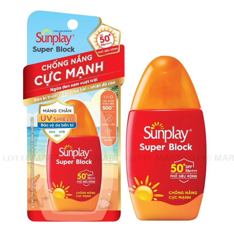 Số lượng quà tặng có hạn. Sữa Chống Nắng Cực Mạnh Sunplay Super Block Tuýp 30G - Là sự kết hợp hoàn hảo giữa khả năng chống tia UVB và lọc tia UVA giúp chống nắng cực mạnh, ngăn ngừa tình trạng sạm đen, bóng đỏ da do cháy nắng. Thành phần: Water, Zinc Oxide, Titanium Dioxide, Octyl Methoxycinnamate, Trimethylsiloxysilicate, Butylene Glycol… Sản phẩm bổ sung Vitamin C, E, Pro Vitamin B5 và Hyaluronic Acid giúp tăng cường độ ẩm cho da luôn mềm mượt, mịn màng.