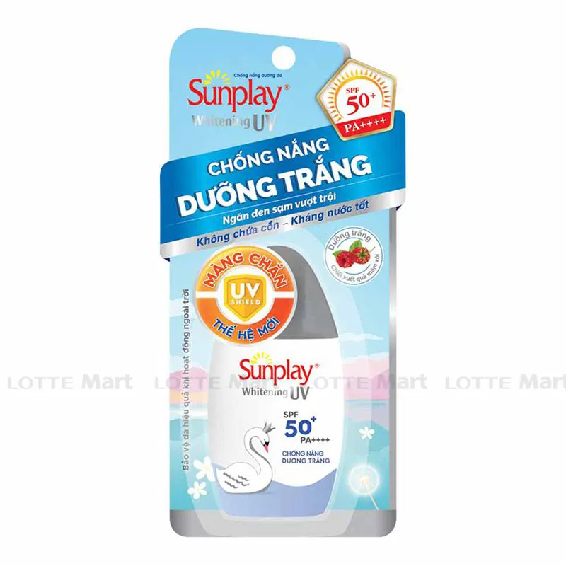 Sữa Chống Nắng Dưỡng Da Sunplay Whitening UV Tuýp 30G - Sunplay Whitening UV mới giúp bảo vệ da hiệu quả dưới nắng, đồng thời dưỡng da trắng mịn. Dạng sữa thấm nhanh, dịu nhẹ cùng các hạt phấn mịn cho cảm giác khô thoáng, thoải mái khi sử dụng. Thành phần: Water, Cyclopentasiloxane, Octyl Methoxycinnamate, Zinc Oxide, Isononyl Isononanoate, Methylhydrogenpolysiloxane Sản phẩm không mùi.