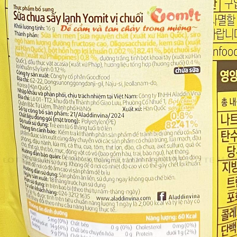 - Sữa lên men [sữa nguyên chất (xuất xứ Hàn Quốc), siro ngô hàm lượng đường fructose cao, Oligosaccharide, kem sữa (xuất xứ Hàn Quốc), bột hỗn hợp lợi khuẩn 0.002%] 82.41%, bột chuối sấy lạnh (xuất xứ Philippines) 0.8%, đường trắng, tinh bột khoai tây (xuất xứ Hàn Quốc), dầu thực vật acasia (xuất xứ Pháp), hương liệu tổng hợp (hương chuối) 0.4%, lợi khuẩn sấy lạnh 0.12%.