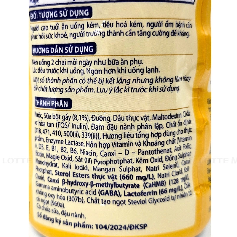 - Nước, Sữa bột gầy, Đường, Dầu thực vật, Maltodextrin, Chất xơ hòa tan, Đạm đậu nành phân lập, Chất ổn định, Hương liệu tổng hợp dùng cho thực phẩm, Enzyme Lactase, Hỗn hợp Vitamin và khoáng chất (Vitamin A, D3, E, B1, B2, B6, Niacin, Canxi - D - Pantothenat, Axit Folic, Biotin, Magie Oxid, Sắt (III) Pyrophotphat, Kẽm Oxid, Đồng Sulphat Monohydrat, Kali Iodid, Mangan Sulphat, Natri Selenit), Canxi Photphat, Sterol Esters thực vật, Natri Clorid, Kali Clorid, CaHMB, GABA, Lactoferrin, Chất chống oxy hóa, Chất tạo ngọt Steviol Glycosid tự nhiên từ cỏ ngọt.