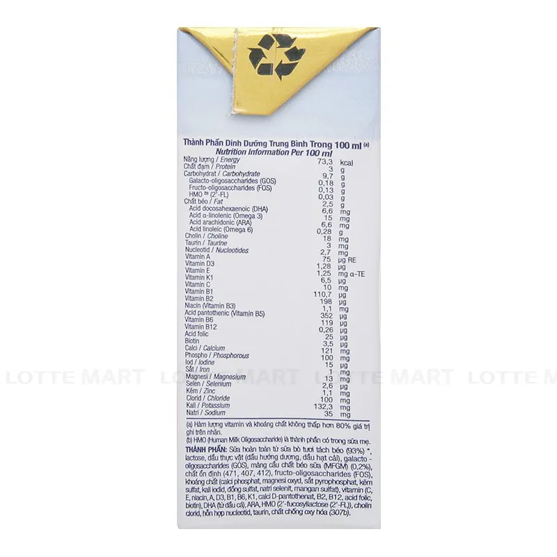 - Sữa hoàn toàn từ sữa bò tươi tách béo (93%) *, lactose, dầu thực vật (dầu hướng dương, dầu hạt cải), galacto oligosaccharides (GOS), màng cầu chất béo sữa (MFGM) (0,2%), chất ổn định (471, 407, 412), fructo oligosaccharides (FOS), khoáng chất (calci phosphat, magnesi oxyd, sắt pyrophosphat, kẽm sulfat, kali iodid, đồng sulfat, natri selenit, mangan sulfat), vitamin (C, E, niacin, A, D3, B1, B6, K1, calci D-pantothenat, B2, B12, acid folic, biotin), DHA (từ dầu cá), ARA, HMO (2’-fucosyllactose (2’-FL)), cholin clorid, hỗn hợp nucleotid, taurin, chất chống oxy hóa (307b).