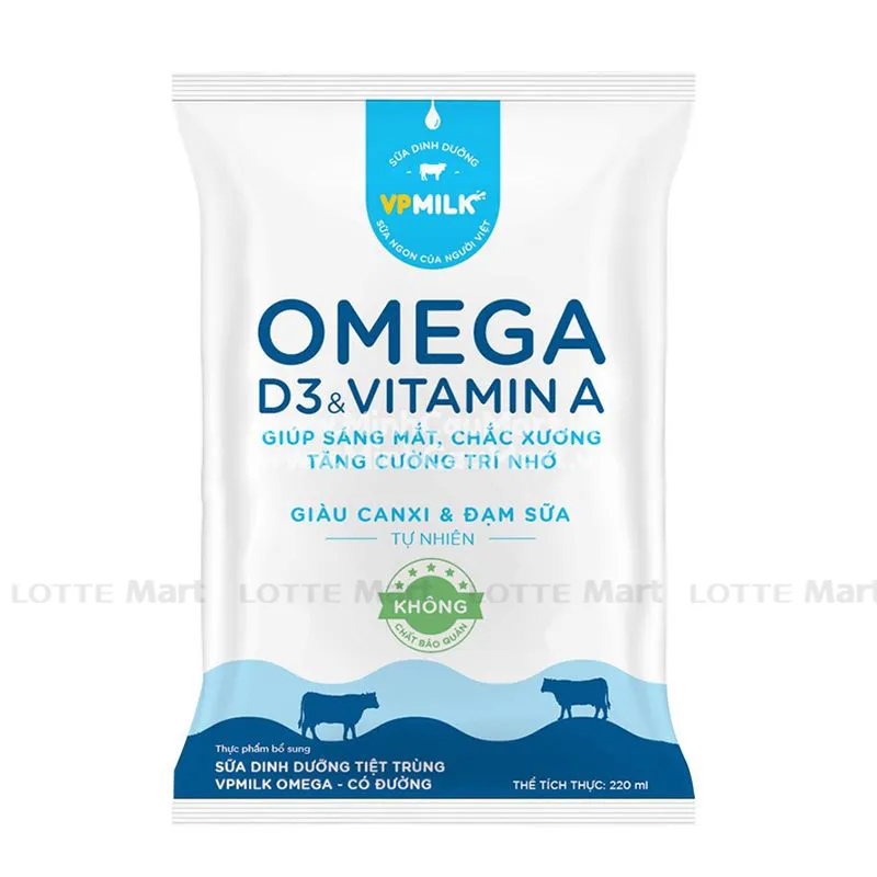 Sữa Dinh Dưỡng Tiệt Trùng Omega VPMilk Có Đường 220ml với công thức dưỡng chất hoàn thiện, kết hợp Vitamin A giúp sáng mắt, VItamin D3 hỗ trợ hấp thu canxi và bổ sung Omega giúp tăng cường trí nhớ, hỗ trợ ngăn ngừa giảm trí nhớ.