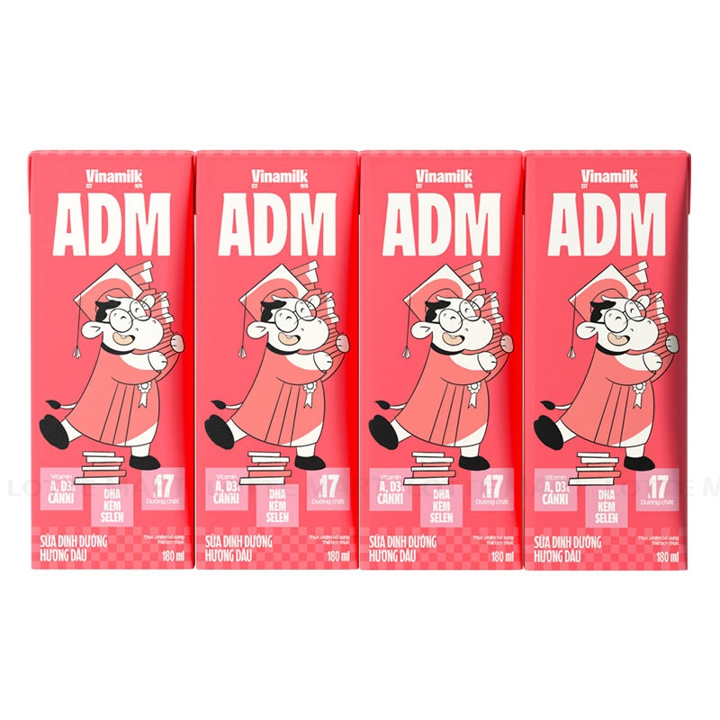 4 hộp sữa dinh dưỡng hương dâu Vinamilk ADM 180ml với công nghệ UHT giúp giữ nguyên hương dâu thơm lừng.