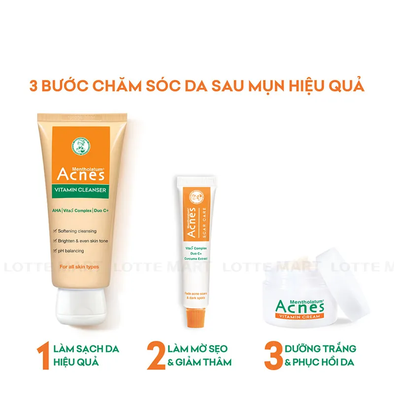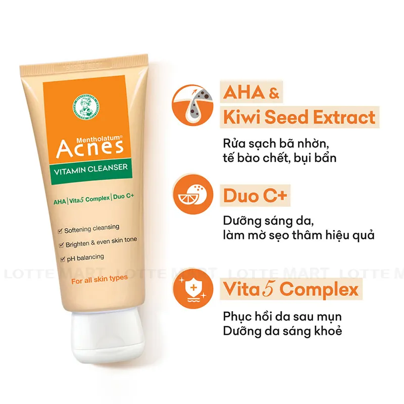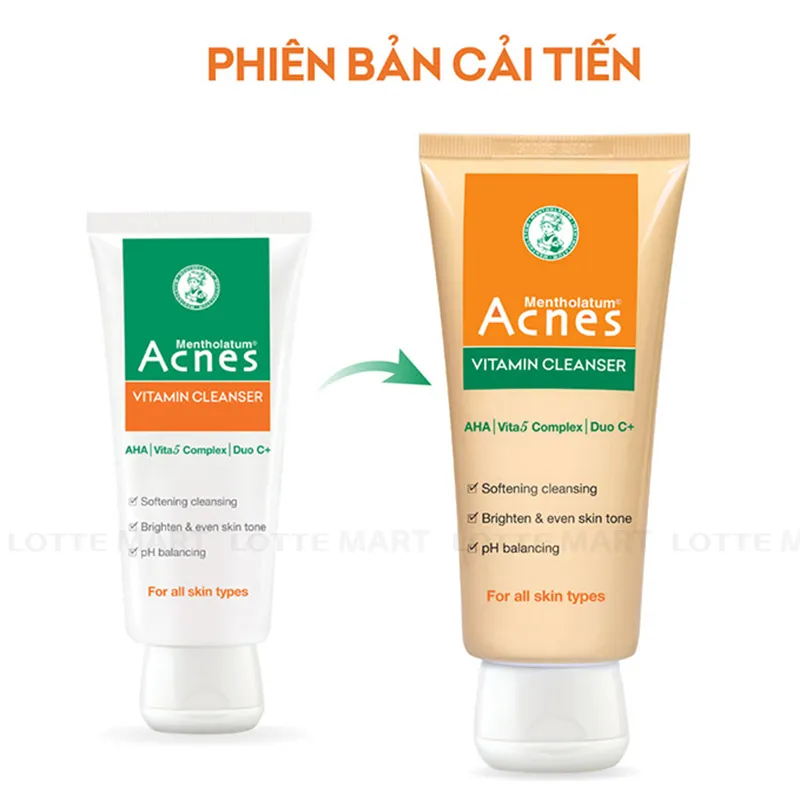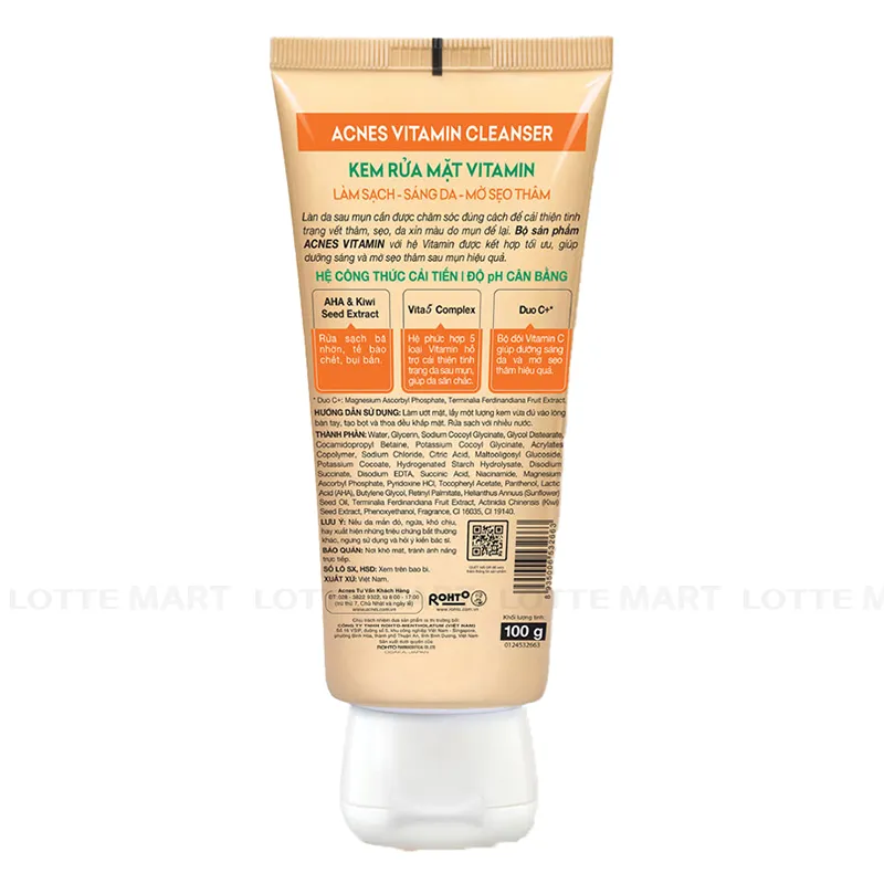 Kem Rửa Mặt Acnes Vitamin Cleanser với các thành phần vitamin cần thiết như: Vitamin A, E, C, B3, B5,...sẽ vừa giúp nhẹ nhàng làm sạch da hiệu quả, vừa có thể giúp da sáng khỏe, mờ dần vết thâm mụn và giúp mô sợi collagen trở nên săn chắc hơn.Kem Rửa Mặt Acnes Vitamin Cleanser với công thức dịu nhẹ giúp nhẹ nhàng lấy đi bã nhờn, bụi bẩn trên da và sâu trong lỗ chân lông. Sản phẩm có kết cấu dạng kem mềm mịn giúp dễ dàng tạo bọt, và giúp loại bỏ các tạp chất trên da khá dễ dàng.Vitamin A: Giúp làm giảm các dấu hiệu lão hóa, đồng thời hỗ trợ làm sáng vùng da xỉn màu.