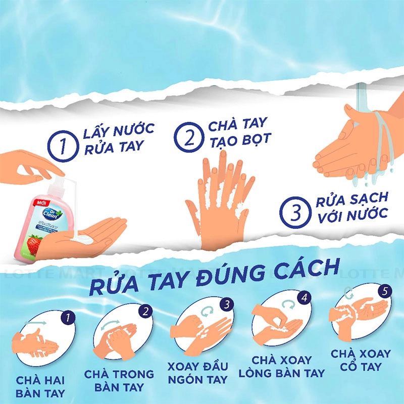 Làm ướt tay rồi cho một lượng vừa đủ sữa rửa tay vào lòng bàn tay, xoa đều trên 10 giây và rửa sạch với nước.