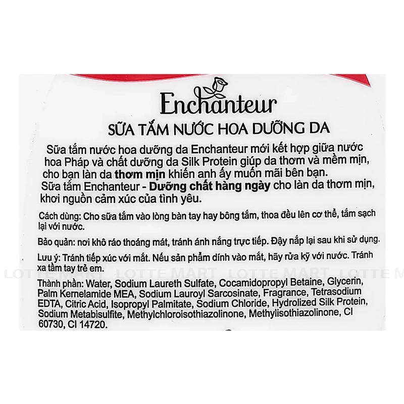 Hướng dẫn sử dụng: Làm ướt cơ thể, sau đó lấy một lượng sữa tắm Enchanteur vừa đủ vào lòng bàn tay và tạo bọt, mát xa nhẹ nhàng lên toàn bộ cơ thể, rồi rửa lại với nước sạch.