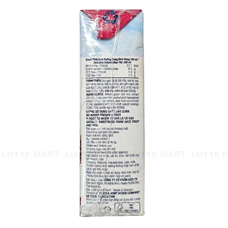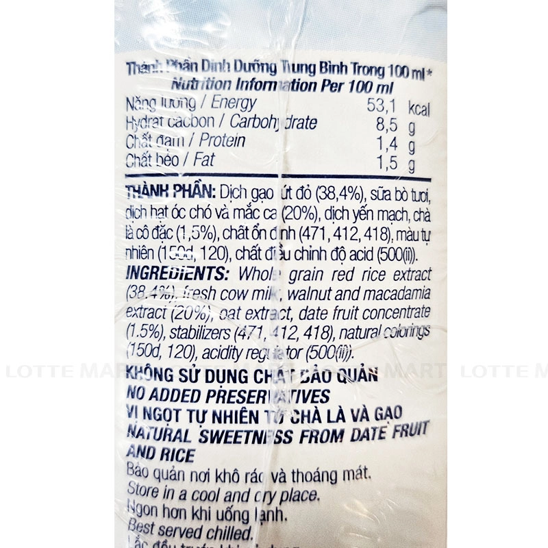- Dịch gạo lứt đỏ (38,4%), sữa bò tươi, dịch hạt óc chó và mắc ca (20%), dịch yến mạch, chà là cô đặc (1,5%), chất ổn định (471, 412, 418), màu tự nhiên (150d, 120), chất điều chỉnh độ acid (500(ii)).