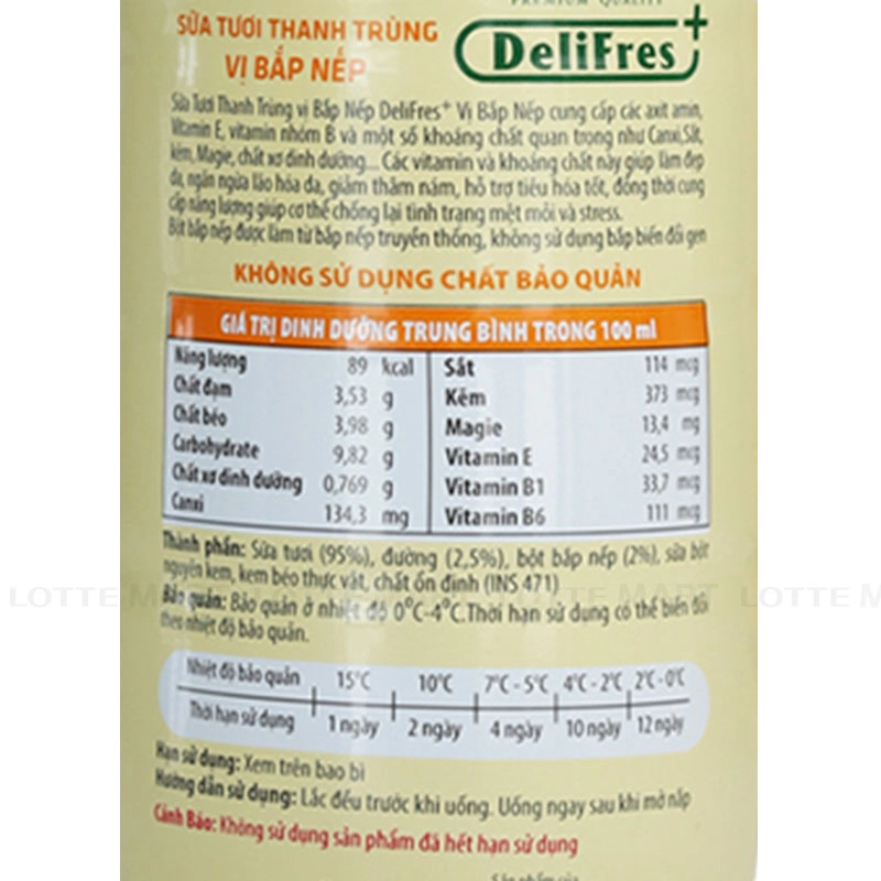 - Sữa Tươi Thanh Trùng Vị Bắp Nếp DeliFres+ được làm từ sữa tươi nguyên chất, mang đến sự tươi mới và hương vị nhẹ nhàng, dễ dùng mỗi ngày.