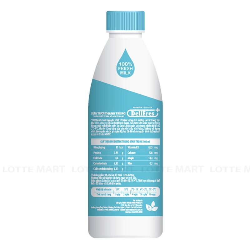 - Sữa Tươi Thanh Trùng DeliFres+ Ít Đường được làm từ 100% sữa bò tươi nguyên chất, thu hoạch tại các trang trại công nghệ cao của DeliFres+.