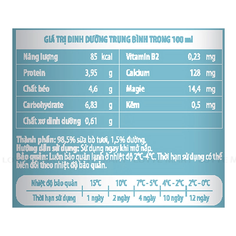 Thành phần: 98.5% sữa bò tươi, 1.5% đường.