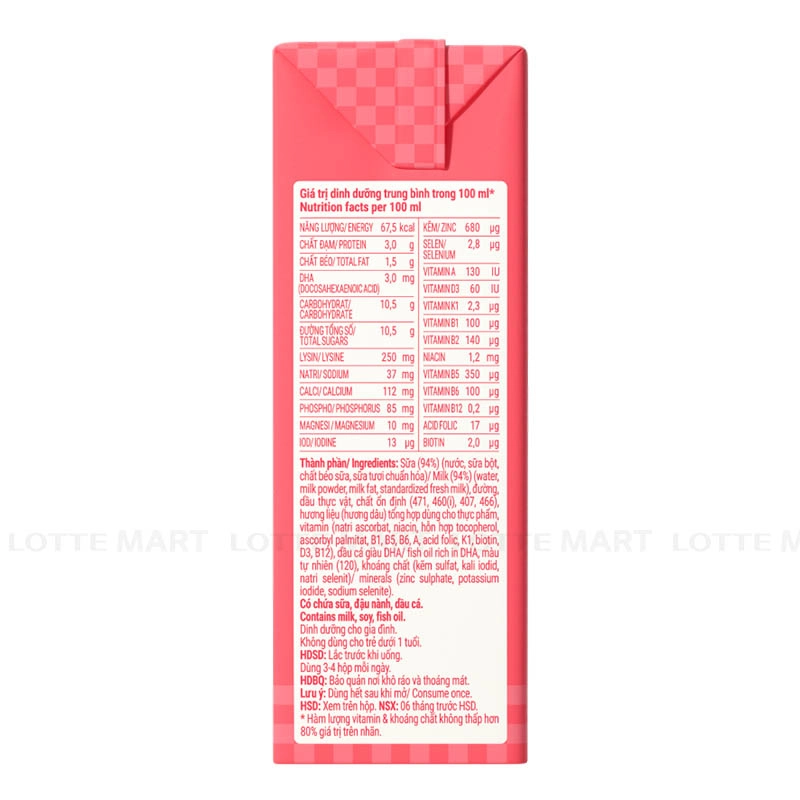 Sữa tươi được đóng trong hộp nhỏ gọn, thuận tiện cho việc mang theo bên mình. Sản phẩm có hương dâu thơm ngon tự nhiên, đặc biệt thích hợp trong quá trình phát triển thể chất và trí tuệ của các bé.