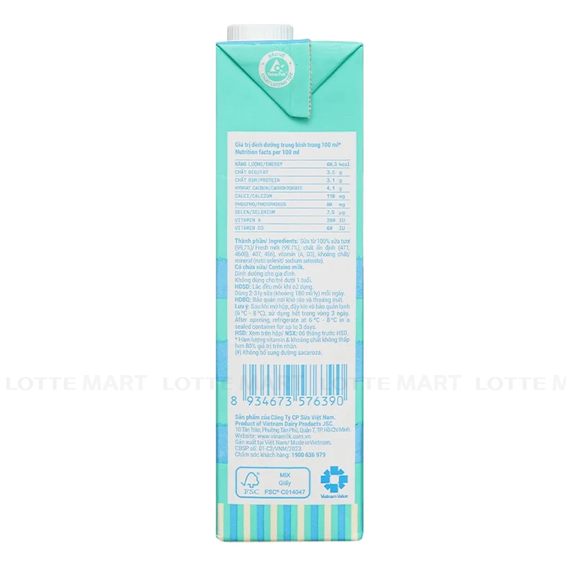 Thành phần: Sữa từ 100% sữa tươi (99.7%), chất ổn định (471, 460(i), 407, 466), vitamin (A, D3), khoáng chất (natri selenit / sodium selenite).