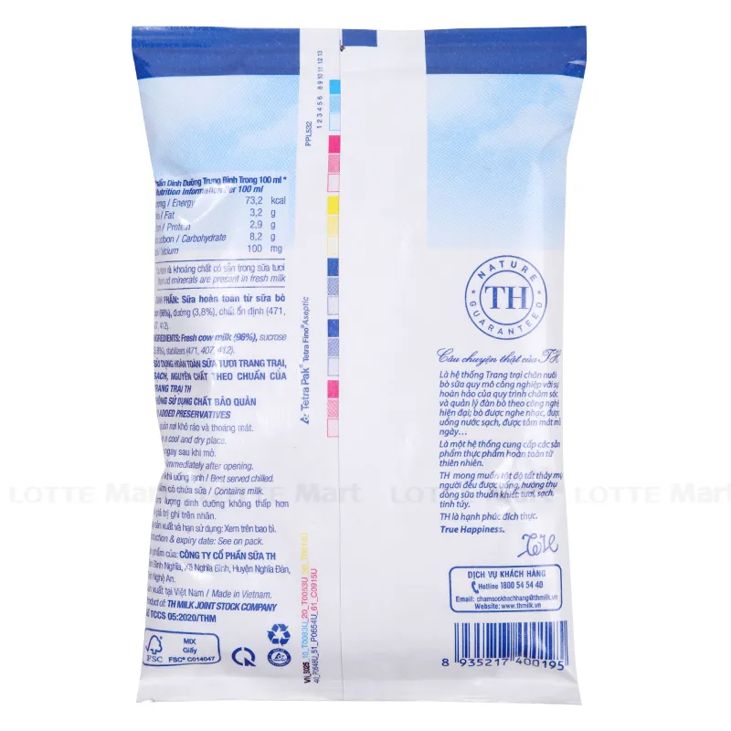 Sữa Tươi Tiệt Trùng TH True Milk Có Đường Bịch 220ML được làm hoàn toàn từ sữa bò tươi của trang trại TH Milk. Vì thế, sản phẩm được giữ trọn những dưỡng chất và hương vị tự nhiên. Sản phẩm được sản xuất theo một quy trình sạch, khép kín từ đồng cỏ đến bàn ăn. Sản phẩm không sử dụng chất bảo quản.
