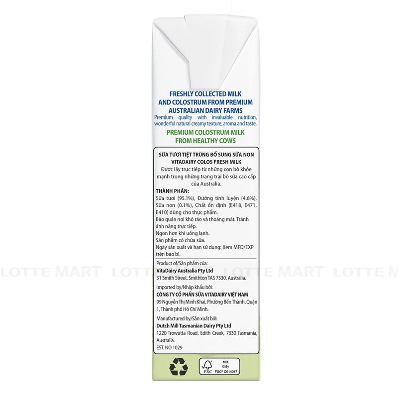 - Sữa Tươi Tiệt Trùng VitaDairy Colos Fresh là sản phẩm độc đáo, bổ sung sữa non tươi giàu kháng thể và các yếu tố miễn dịch. Với công thức đặc biệt, sữa non tươi không chỉ giúp tăng cường hệ miễn dịchvmà còn cung cấp những dưỡng chất thiết yếu cho cơ thể, đảm bảo sức khỏe cho cả gia đình.