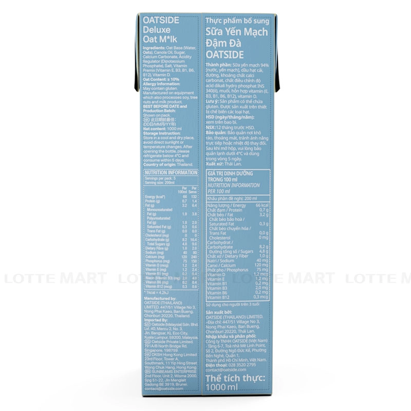 - Sữa Yến Mạch Oatside Đậm Đà là thức uống từ yến mạch dễ uống, nhẹ nhàng và dễ tiêu hóa. Với thành phần chính là yến mạch tự nhiên kết hợp dầu thực vật và muối, sản phẩm mang đến hương vị thanh dịu khi thưởng thức.