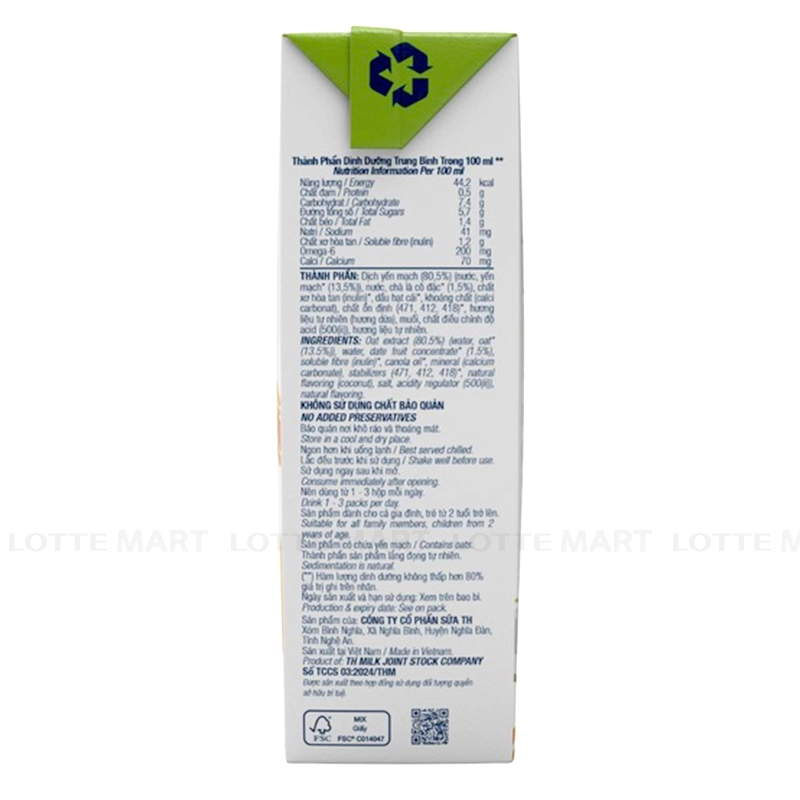 - Dịch yến mạch (80,5%) (nước, yến mạch* (13,5%)), nước, chà là cô đặc* (1,5%), chất xơ hòa tan (inulin)*, dầu hạt cải*, khoáng chất (calci carbonate), chất ổn định (471, 412, 418)*, hương liệu tự nhiên (hương dừa), muối, chất điều chỉnh độ acid (500(ii)), hương liệu tự nhiên.)