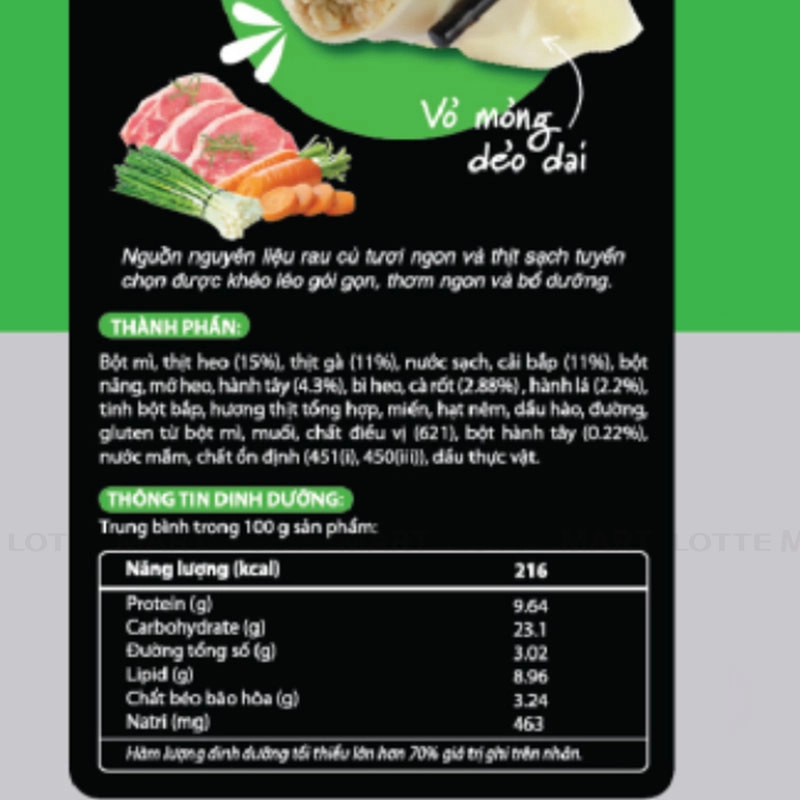 - Bột mì, thịt heo (15%), thịt gà (11%), nước sạch, cải bắp (11%), bột năng, mỡ heo, hành tây (4.3%), bì heo, cà rốt (2.88%), hành lá (2.2%), gia vị (đường, muối, nước mắm), tinh bột bắp, hương thịt tổng hợp (0.8%), miến, hạt nêm, dầu hào, gluten từ bột mì, bột hành tây (0.22%), chất ổn định (451(i), 450(iii)), dầu thực vật.