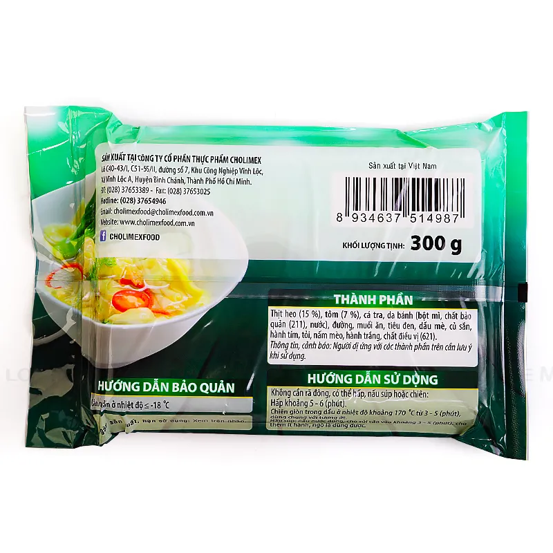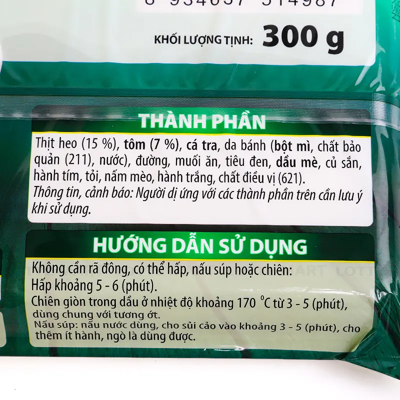 Thành phần: Thịt heo (15%), tôm (7%), cá basa, bột mì, đường, muối ăn, tiêu đen, dầu mè, củ sắn, hành tím, tỏi, nấm mèo, hành trắng, nước, chất điều vị: Mononatri glutamat (621).