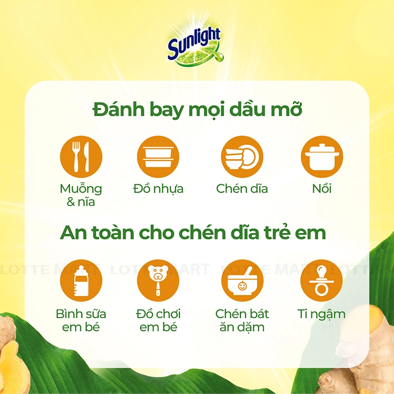 Nước Rửa Chén Sunlight Thiên Nhiên Hương Gừng là sản phẩm của nhà Sunlight - nước rửa chén bát Sunlight Bio-care với công nghệ độc quyền Rhamno Clean chứa 100% hoạt chất làm sạch gốc thực vật. Với cải tiến trong công thức, Sunlight Bio-care mới mang đến chuẩn mực an toàn mới, đảm bảo an toàn cho chén dĩa trẻ em và thân thiện với môi trường.