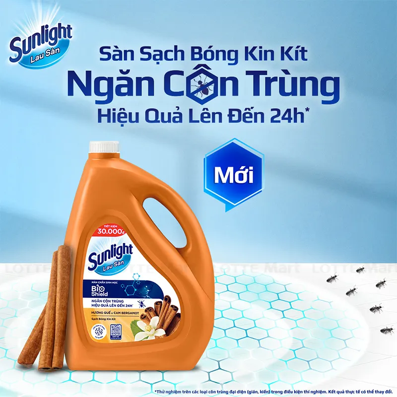 - Lần đầu tiên trên thị trường ra mắt Nước Lau Sàn Sunlight BIOSHIELD Quế & Cam Bergamot Chai 3.6kg, với công nghệ đột phá màn chắn sinh học BioShield kết hợp cùng tinh dầu thảo mộc, không chỉ giúp sàn nhà sạch bóng kin kít, ngát hương thơm mát mà còn ngăn đuổi các loại côn trùng phổ biến như kiến, gián lên đến 24h.
