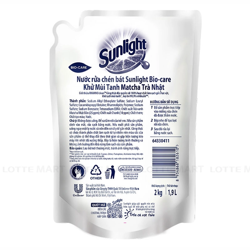 Nước Rửa Chén Sunlight Hương Trà Xanh Nhật Khử Mùi Tanh là sản phẩm của nhà Sunlight - nước rửa chén bát Sunlight Bio-care mới với công nghệ độc quyền Rhamno Clean chứa 100% hoạt chất làm sạch gốc thực vật. Với cải tiến trong công thức, Sunlight Bio-care mới mang đến chuẩn mực an toàn mới, đảm bảo an toàn cho chén dĩa trẻ em và thân thiện với môi trường.