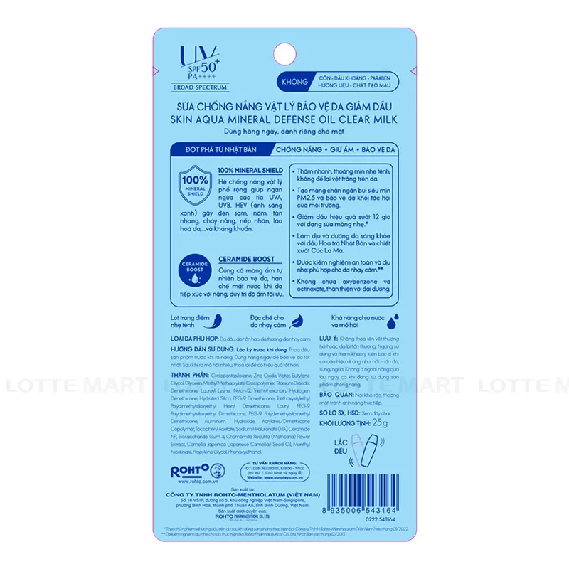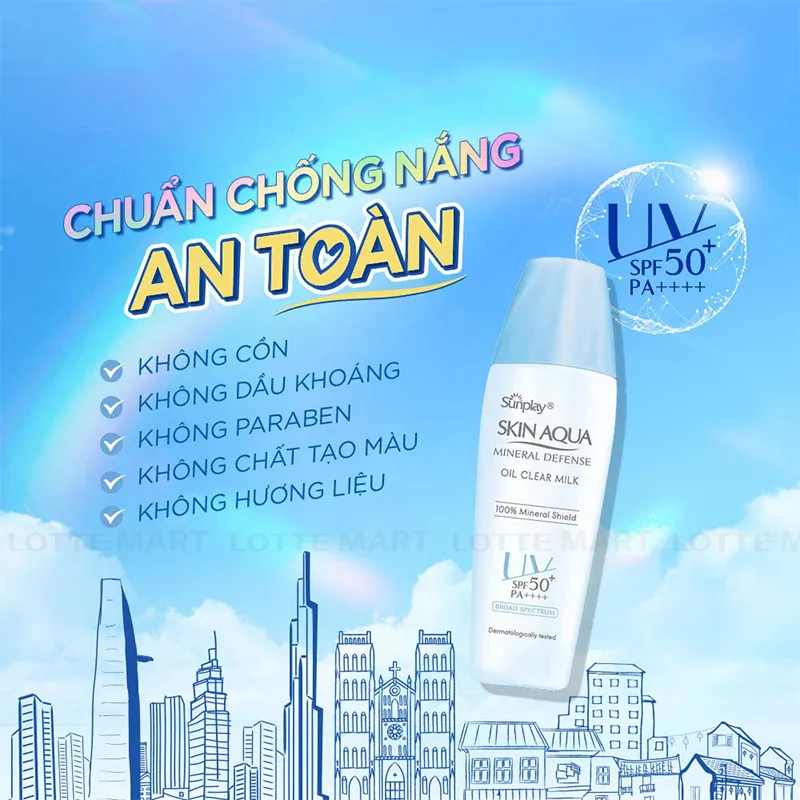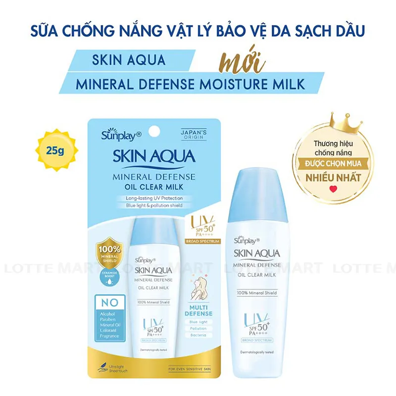 - Sữa Chống Nắng Vật Lý Bảo Vệ Da Giảm Dầu Sunplay Skin Aqua đảm bảo các yêu cầu chống nắng lý tưởng cho làn da dầu. Kết cấu dạng sữa dễ thấm thấu, tránh tình trạng bết dính gây nhờn, bít tắc trên da. Có khả năng kiềm dầu nổi bật lên đến 12 giờ. Skin Aqua Mineral Defense Oil Clear Milk không chứa dầu khoáng, cồn, hương liệu giúp giảm thiểu tình trạng kích ứng và nổi mụn, nhất là đối với làn da dầu nhạy cảm.