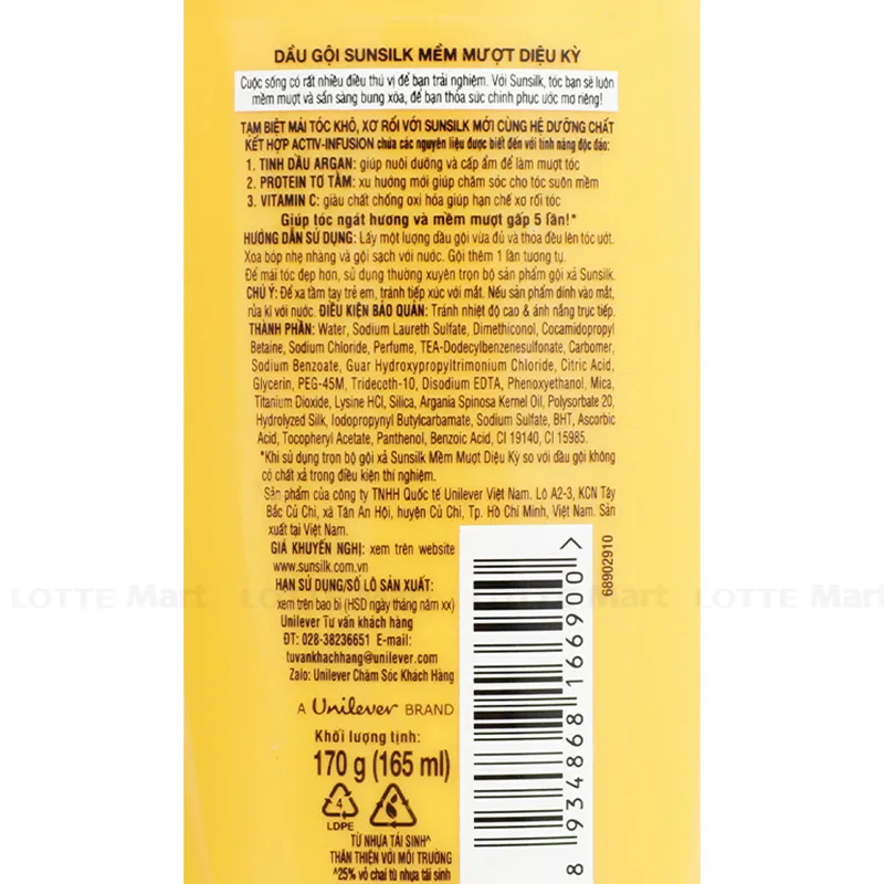 - Dầu gội Sunsilk mềm mượt diệu kỳ 165ml phù hợp cho hầu hết các tình trạng tóc, với công thức đặc biệt giúp lưu giữ độ ẩm cho mái tóc, sẽ phù hợp cho những mái tóc xơ rối, khó vào nếp và thiếu đi óng ả suôn mềm. sản phẩm phù hợp cho cả nam và nữ giới.